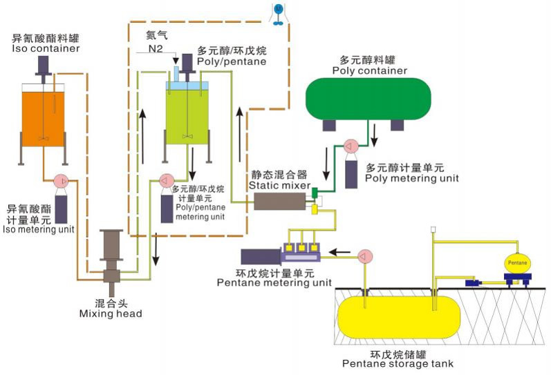 隨著聚氨酯行業淘汰ODS工作的深入開展,采用環戊烷作發泡劑替代CFC的聚氨酯泡沫新工藝得到了越來越廣泛的應用,為此,武漢正為機械有限公司致力于推進中國ODS改造工作的進程,符合德國TüV標準的環戊烷系列發泡設備,適用于冰箱、冷柜、夾芯板、保溫建材等行業的無氟替代改造的需求。環戊烷發泡系統工藝流程圖環戊烷高壓發泡機環戊烷儲存系統多元醇/環戊烷靜態預混系統多元醇/環戊烷靜態預混系統環戊烷安全檢測裝置工廠抽排風系統